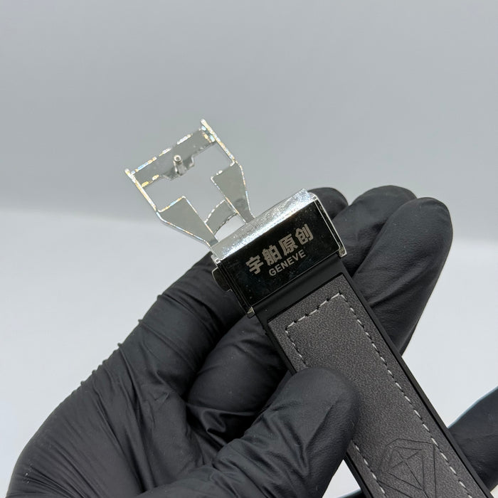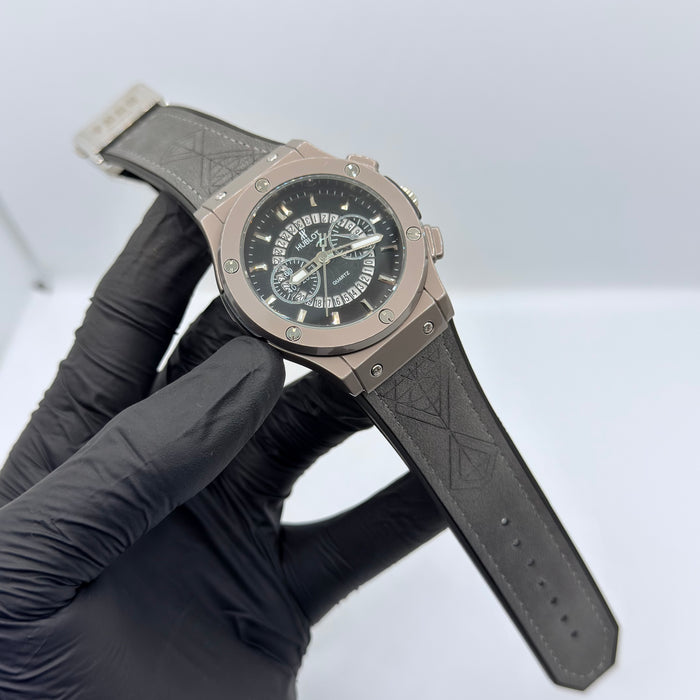 "A bold, modern timepiece designed in the style of the Hublot Big Bang collection. It features a matte grey case with exposed bezel screws and a black multi-function dial displaying a circular date calendar and the 'QUARTZ' designation. The watch is completed with a distinctive black and grey integrated leather strap and a deployant clasp marked with brand references."