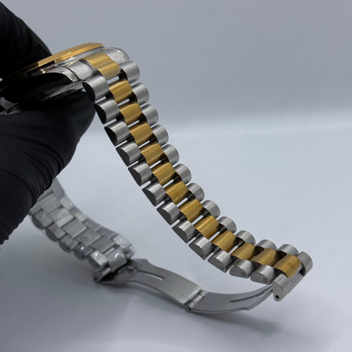 This watch is a version of the classic Rolex Datejust model. It is a two-tone timepiece, which Rolex calls Yellow Rolesor, combining Oystersteel (stainless steel)